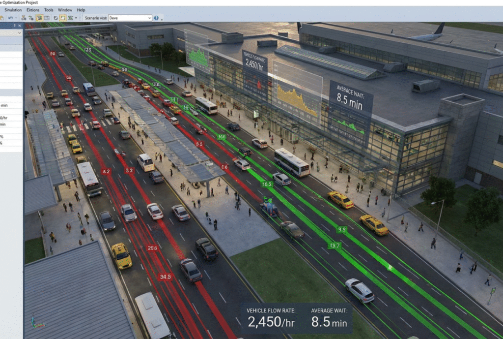 Avinia team uses PTV VISSIM to enable airport planners to model vehicle, pedestrian, and multi-modal interactions in detail: curbside traffic, valet/drop-off zones, transit vehicle arrivals/departures, parking flows, and walking access to terminals.