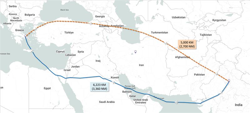 The graphic above shows two routes for Delhi–Athens. The blue line is the longer route that Indigo currently operates on necessitated by the Pakistan and Iranian airspace closure, while the orange line shows the shorter path that a foreign flag carriers may use.